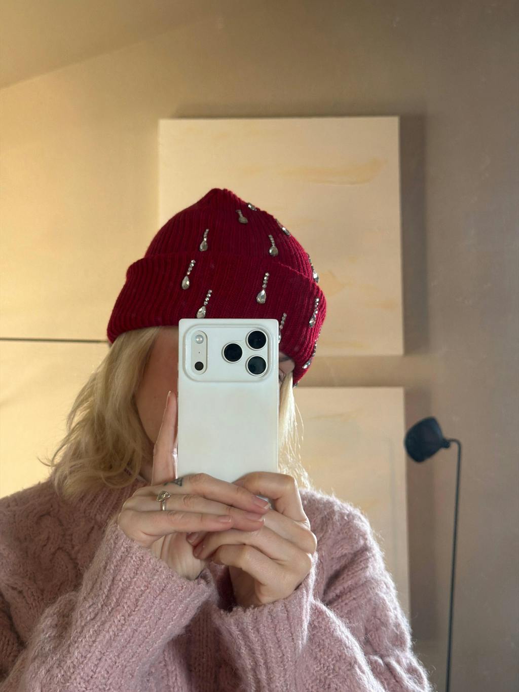 Ribbed knit construction with cascading crystal-drop embellishments. Each teardrop rhinestone is individually set along vertical lines for a structured, elongated effect. Made from mid-weight acrylic yarn with natural stretch and recovery, offering a snug, flexible fit that holds its shape. The fold-over cuff provides a defined edge and additional warmth without bulk. Ideal for transitional and cold-weather styling.