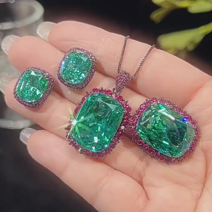 18k gold-plated statement jewelry set featuring an adjustable ring, pendant necklace, and matching earrings, centered around vivid emerald-green tourmaline-look stones framed by a contrasting halo of ruby-tone micro pavé. The design pairs bold rectangular silhouettes with precise prong setting, delivering a high-impact, high-gloss finish...Regular price From $ 982.00Regular priceUnit price / per