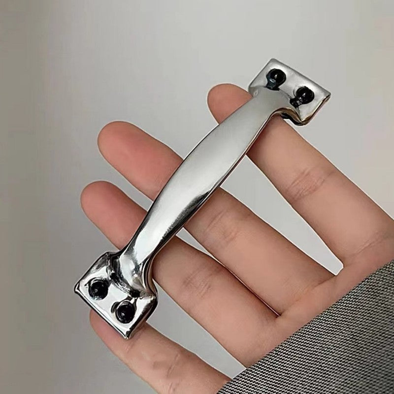 Industrial brooch in polished silver‑tone stainless steel, cast in a classic door‑handle silhouette with sculpted bar and four faux screw heads. Lightweight with a secure dual bar‑pin backing.