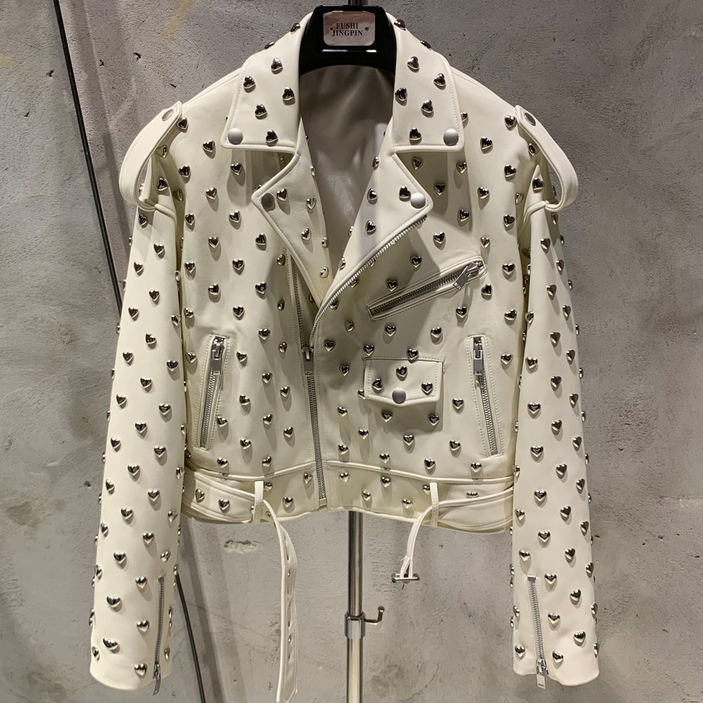 Soft, structured, and unapologetically bold — this piece redefines the biker jacket as an object of art. Crafted from supple, heavy genuine leather, every surface is covered in hand-set silver heart studs that glint with movement and light. The weight is substantial, the texture buttery, and the presence undeniable. A forever piece that balances rebellion with refinement.