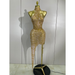 Cut for impact, this sheer black mesh mini hugs the body with a sculpted, halter high-neck and racerback, then drops into an asymmetric dagger hem that elongates the leg. Thousands of silver-tone, crystal-like rhinestones are hand-appliquéd in webbed, diagonal lines to carve out an hourglass effect with high sparkle. The dress is made from stretch polyester-spandex mesh for a slim, flexible fit and finishes with a concealed back zipper. Color: black mesh with clear/silver rhinestones. Silhouette: bodycon sheath. Length: mini with extended side panel.