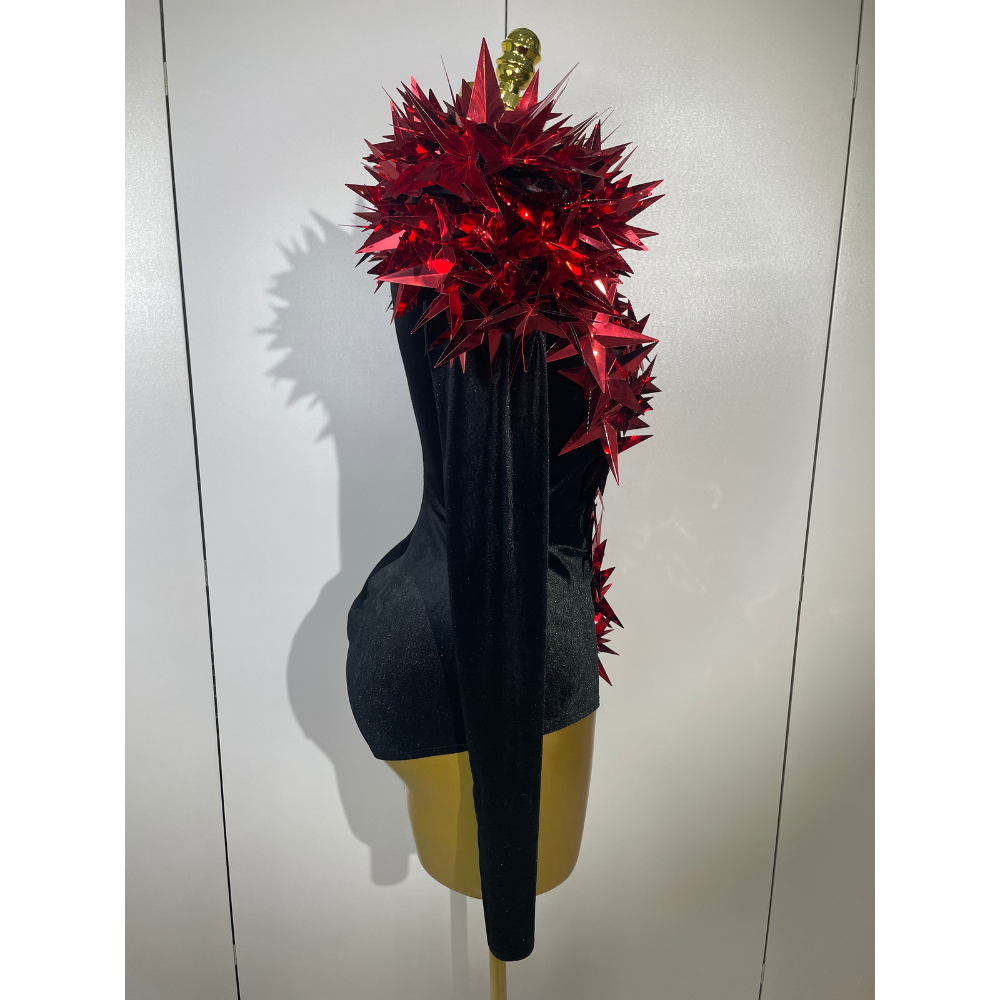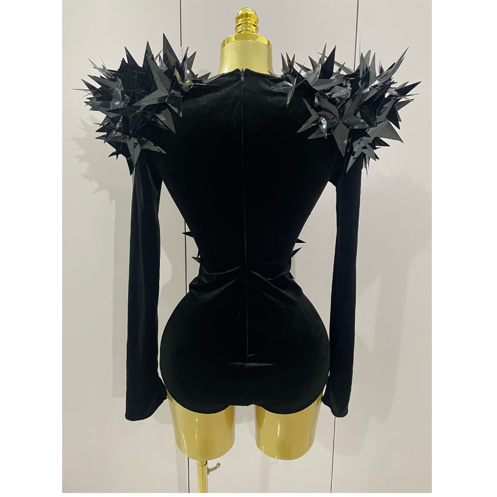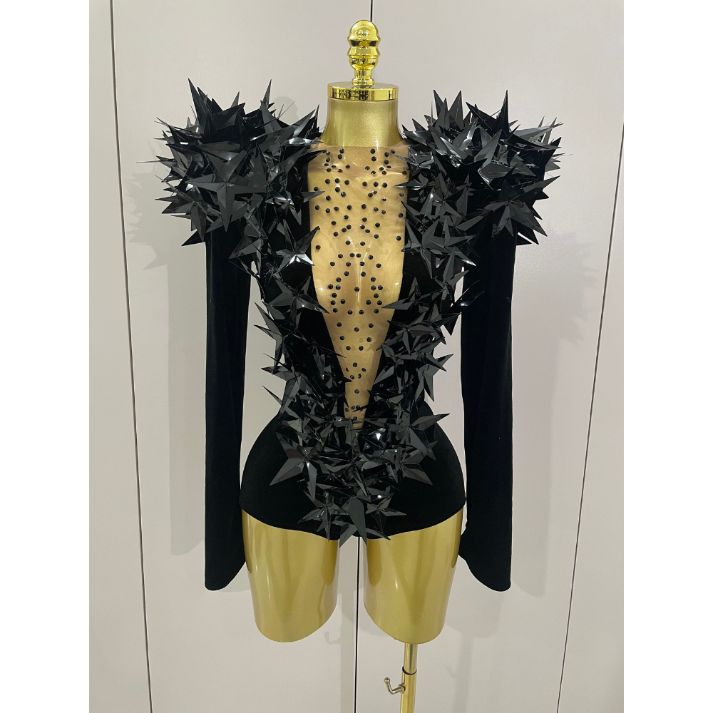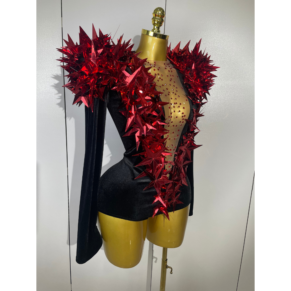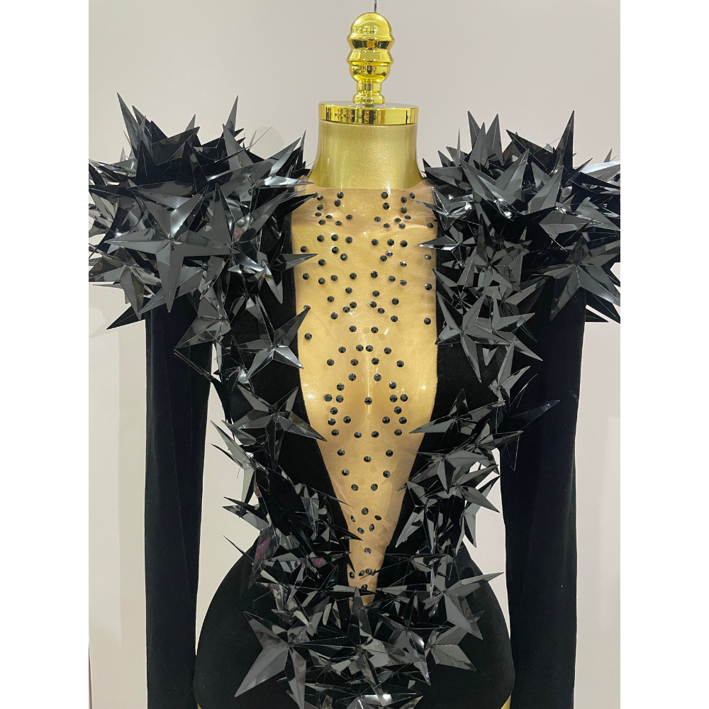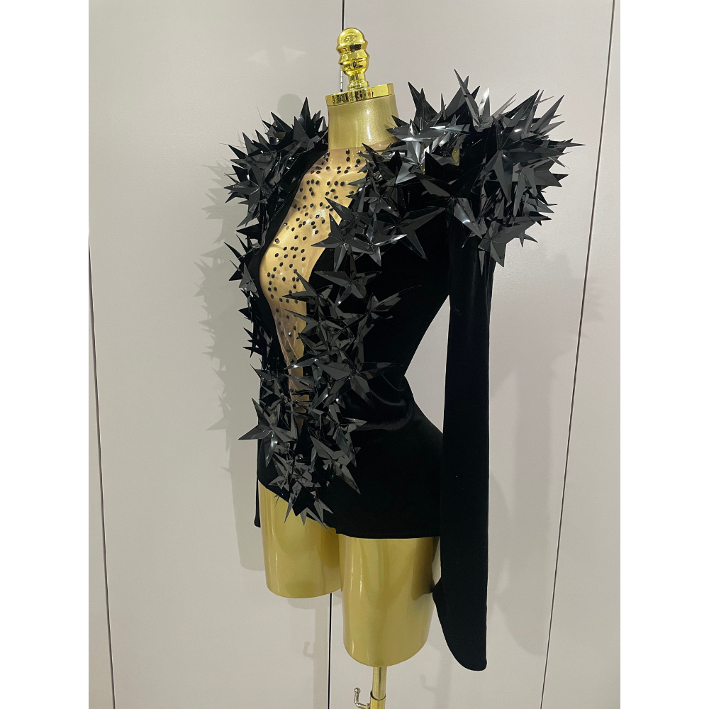 Crafted in velvet, spandex, illusion mesh, and acrylic rhinestones. Recommended for performances, red carpet, or gala hosting. Wear with caution—this one steals the scene.
