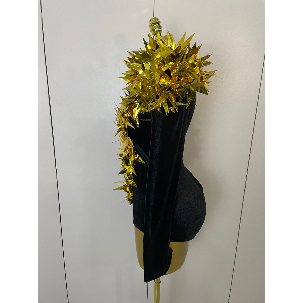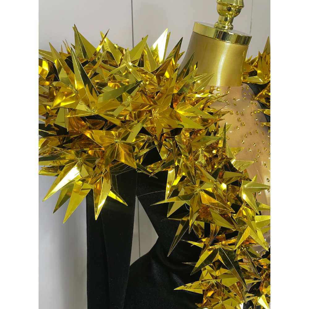 The real drama is in the hand-applied metallic gold starburst appliqués that explode across the shoulders and down the chest—each one light-reflective and dimensional, creating high-shine movement under spotlights or camera flash. Sleek long sleeves balance out the bold front detail, giving it a clean finish from the back.