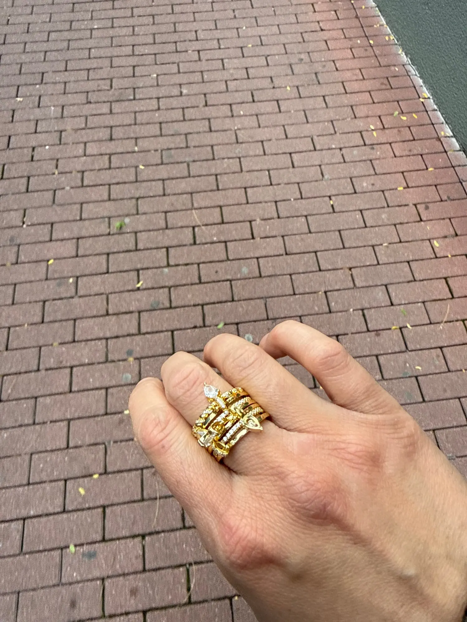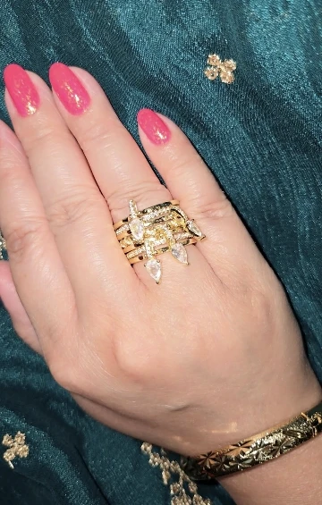 18k gold-plated multi-band statement ring set featuring a playful stack of pavé and smooth bands, finished with cascading pear-cut cubic zirconia drops. Designed to catch the light and the eye, this layered silhouette brings movement, sparkle, and flirtatious drama to every hand gesture.
