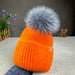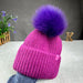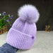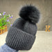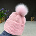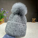 Woman wearing a beige knit beanie with a pom-pom on a light gray background