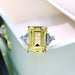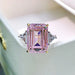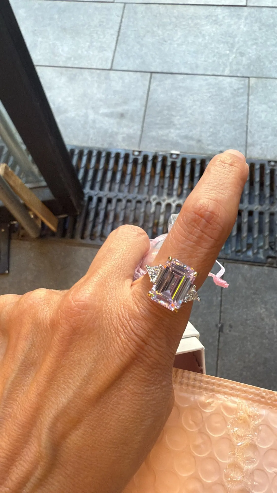 The center stone is lab-created (synthetic) and available in yellow topaz–tone, pink quartz–tone, or clear lab diamond–style finishes. Tapered side stones accent the setting, adding dimension and brilliance while maintaining a refined, architectural profile.