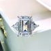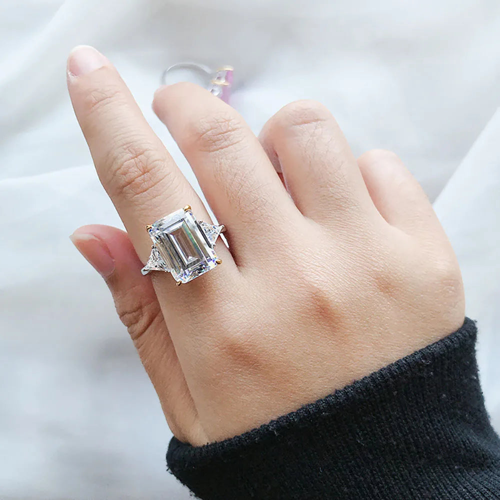 Crafted in solid 925 sterling silver, this ring features a bold emerald-cut center stone measuring approximately 10 × 14 mm, secured in a classic prong setting that highlights the stone’s clean geometry and elongated silhouette. The band is polished to a high-shine finish and...