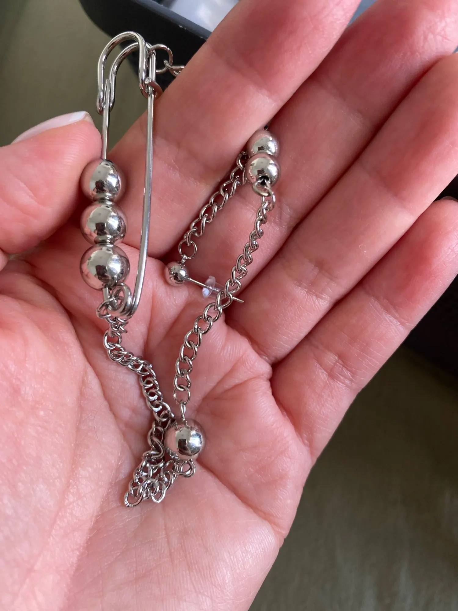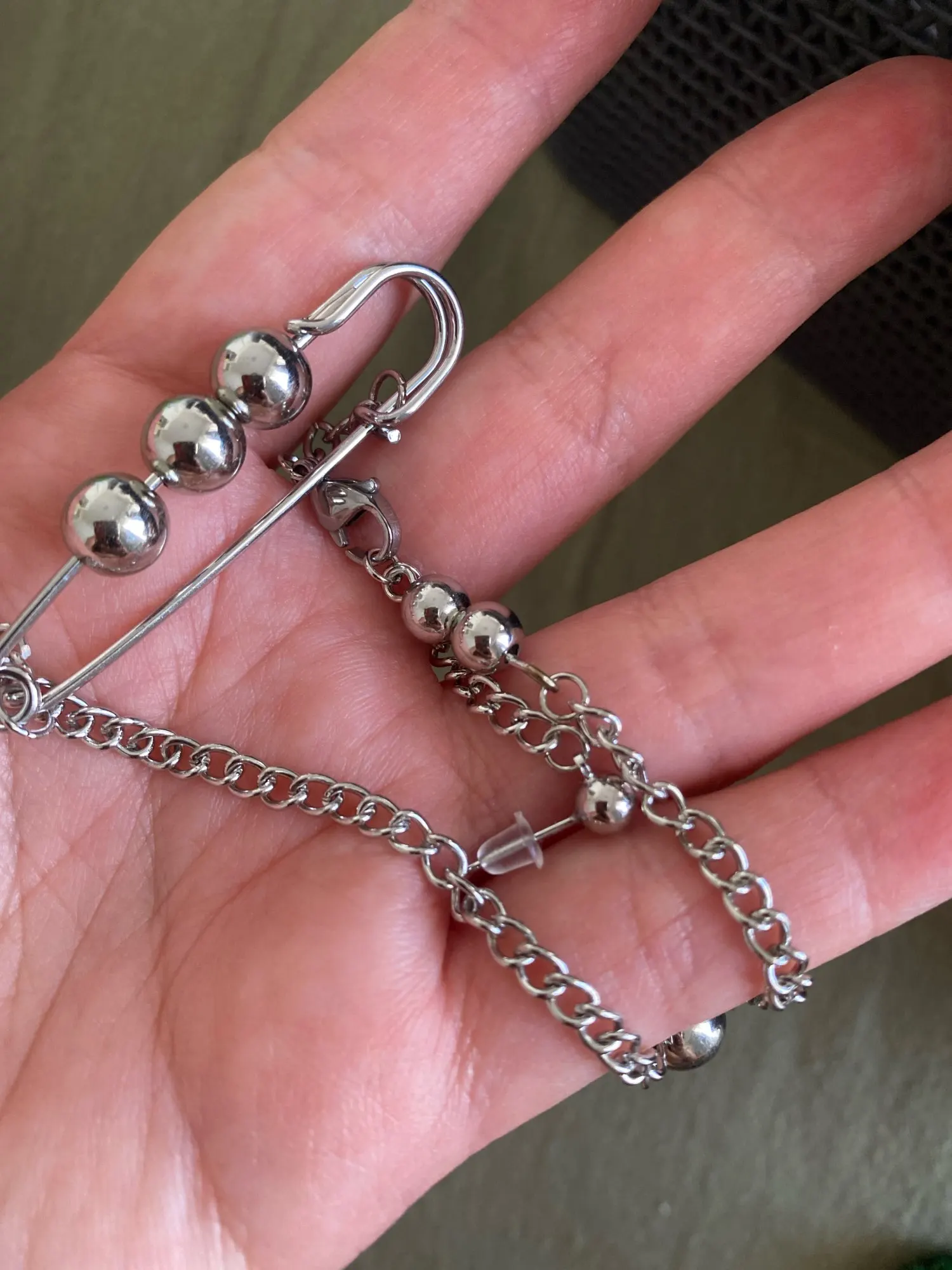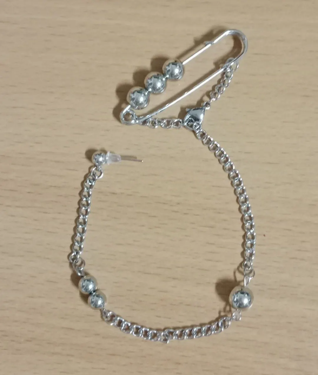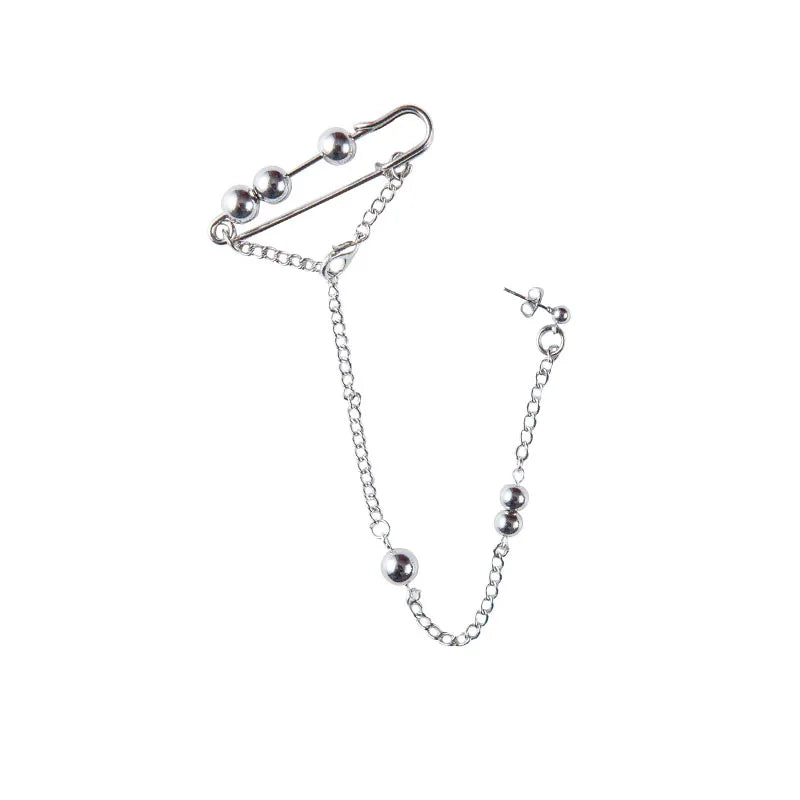 Polished metal ear cuff with integrated chain and ball-link detailing. The sculptural silhouette connects a top cuff to a lower clip earring with a suspended dual-chain link, creating a modern, industrial effect. Designed for non-pierced wear with a secure pressure clip and smooth ear cuff. Made from lightweight copper alloy with a high-shine silver finish. Unisex design that blends Y2K and neo-gothic influences for a bold asymmetrical statement.